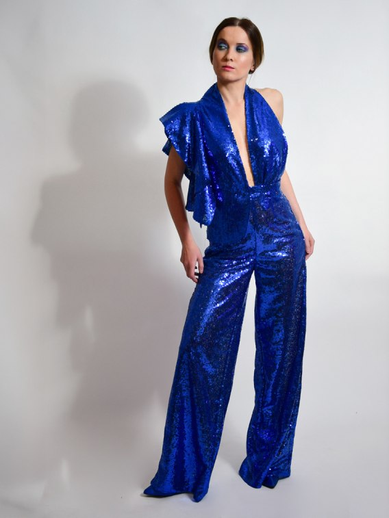 Kombinezon wykonany z lśniących cekinów, co sprawia wrażenie odbijania światła podczas ruchu. Odsłonięte plecy i głęboki dekolt dodają subtelnego zmysłowego wdzięku, podkreślając kobiecą delikatność. Kombinezon zapinany jest z tyłu na zamek, natomiast górna część z falbaną zapinana jest z przodu na napę.