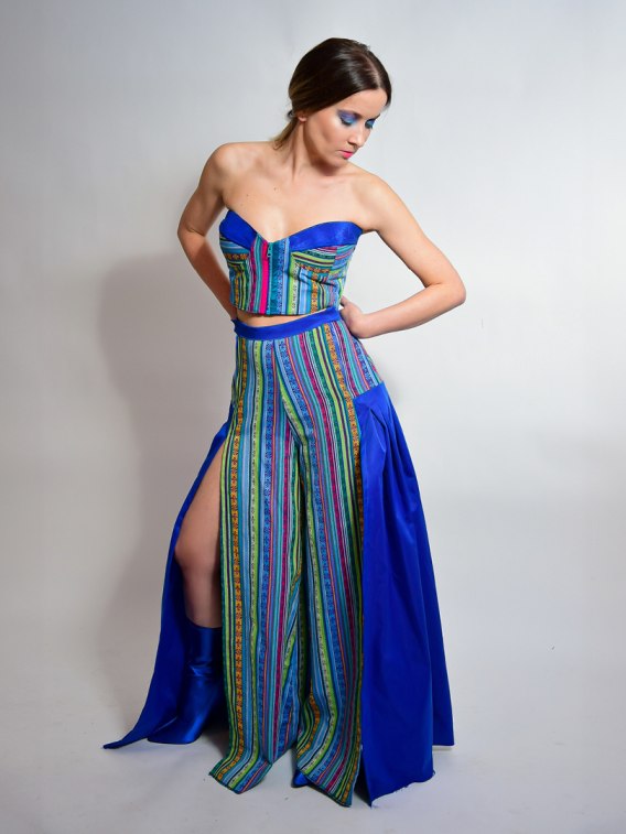 Dwuelementowy komplet składający się z kolorowego topu, zapinanego z przodu na zamek oraz spodni o szerokich nogawkach z wysokim stanem. Spodnie posiadają subtelną wstawkę z plisowanej tkaniny. Ich starannie zaprojektowane rozcięcia na nogawkach dodają im niepowtarzalnego uroku i lekkości. Wykonane są z dwóch tkanin - żakardu i bawegi. Zapinane z przodu na dwa ozdobne zamki i napy.