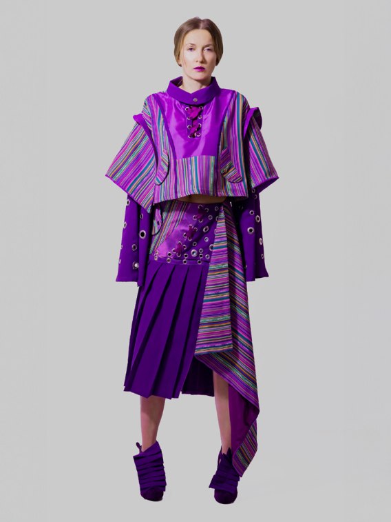 Stylizacja która wyróżnia się swoją niekonwencjonalnością i nowatorskim podejściem do mody. Przykuwa wzrok intensywnymi kolorami, połączeniami tkanin i metalowych elementów. Komplet składa się z asymetrycznej, zwiewnej spódnicy, zapinanej na napy, ozdobionej misternie ułożonymi plisami połączonymi z tkaniną główną za pomocą metalowych oczek, oraz bluzy z szerokimi, podwójnymi rękawami i nietypowym kołnierzykiem zapinanym na napę.