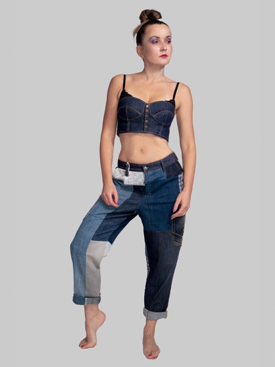 Spodnie patchworkowe wykonane z wysokiej jakości jeansu to niezwykłe połączenie stylu i wygody. Każdy kawałek materiału został starannie dobrany, aby stworzyć unikatowy wzór, który wyróżnia się na tle innych ubrań. Ich wywijane nogawki dodają lekkości i swobodnego charakteru, podkreślając luźny, casualowy styl. Spodnie zapinane na zamek, posiadają dwie kieszenie wewnętrzne oraz dwie kieszenie z przodu i z tyłu co zapewnia miejsce na przechowywanie drobnych przedmiotów, dodając funkcjonalności do ich wyjątkowego designu.
