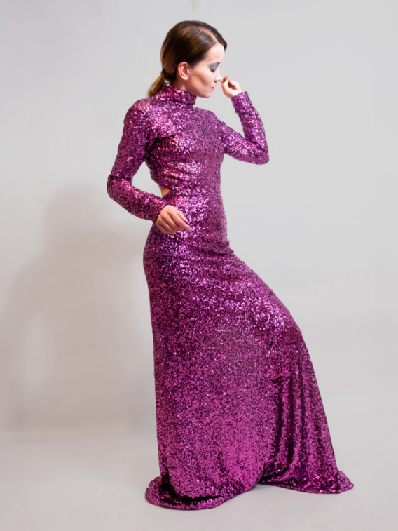 Długa suknia emanująca elegancją i subtelnym seksapilem. Jej powierzchnia pokryta jest tysiącami błyszczących cekinów, które mienią się w każdym ruchu tworząc efektowny widok. Jej głównym elementem są odsłonięte plecy i wysmuklający fason, który znacząco poszerza się ku dołowi, nadając jej lekkości i swobody ruchów. Suknia zapinana jest z tyłu na szyi na dwie napy.