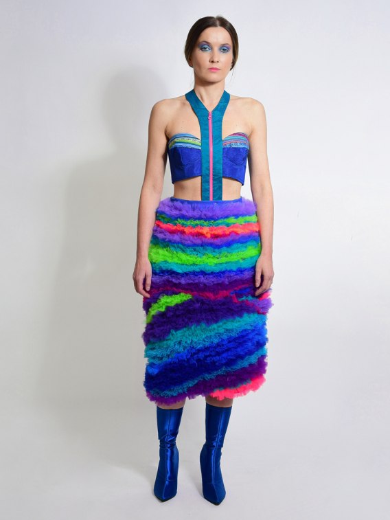 Kolorowy komplet składający się z topu zapinanego na kostkowy zamek, oraz spódnicy z misternie wykonanej struktury. Spódnica zapinana jest z tyłu na zamek rozdzielczy. W połączeniu z topem tworzy harmonijną całość, która zachwyca zarówno intensywnymi kolorami, jak i pięknem struktury.